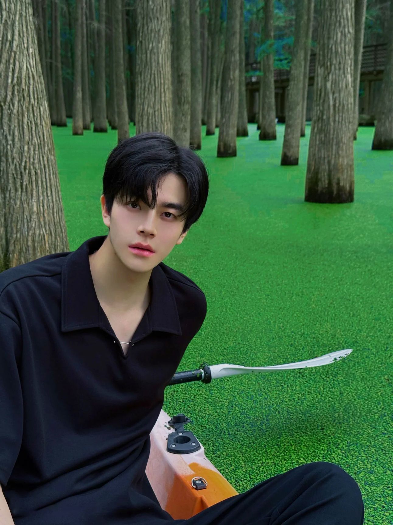 Okay, confession: When Yu-Tai said "Let’s go to Luyang Lake," I wasn’t ready for this. Our little wooden boat slid into tunnels of green – sunlight spearing through the canopy, the water below mirroring the sky like liquid jade. And Yu-Tai? Leaning against the bow like some water spirit poster boy, mist curling around him. Seriously, dude's illegally handsome.